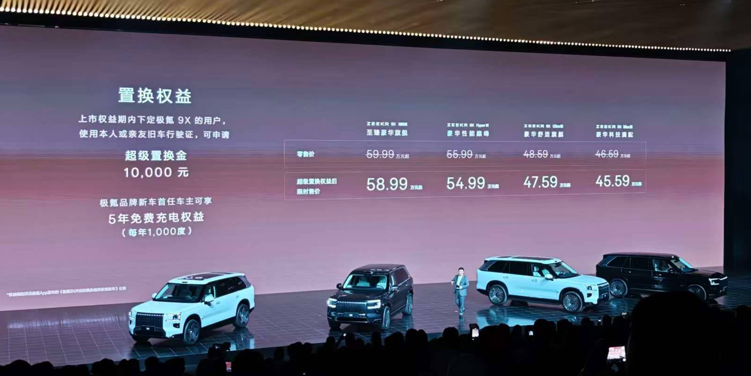 9月29日,极氪品牌全球超豪华SUV新旗舰—极氪9X正式上市。新车共推出Max版、Ultra版、Hyper版和曜黑版四个版型,对应官方指导价为46.59万元、48.59万元、55.99万元和59.99万元起。