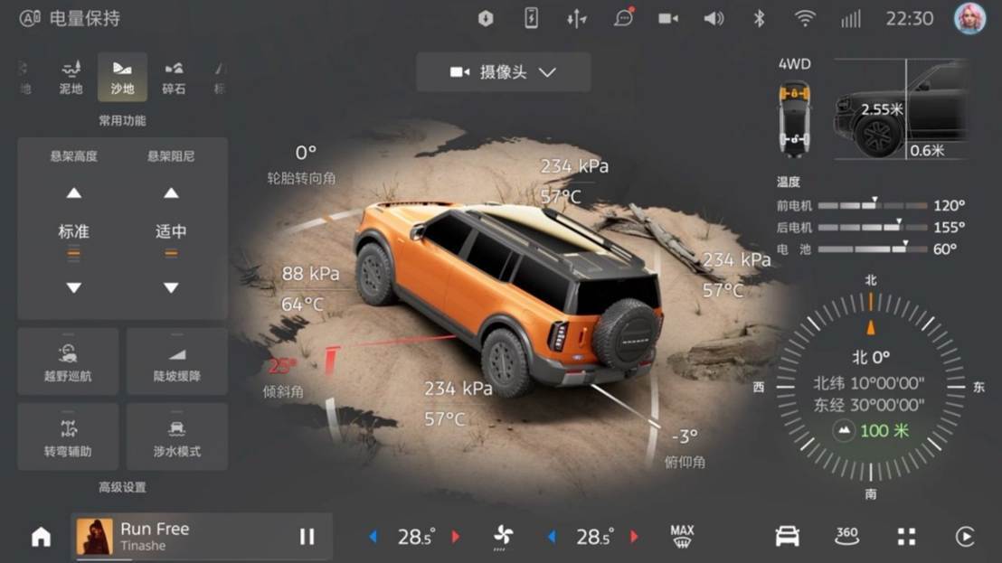 福特智趣烈马在智能化新能源科技加持的同时,还继承了福特烈马家族的越野基因,新车全系标配高性能四驱系统,并搭载前、后机械式差速锁,拥有强大的牵引力与脱困能力,面对复杂路面状况时也能有强大的通过性,从容应对各种非铺装路面。针对越野新手,福特智趣烈马还贴心地搭载“越野360系统”。该系统可实时高精度监测、感知车辆姿态,并实现越野参数同屏显示。它能对潜在的俯仰、侧倾风险发出清晰预警,极大提升复杂地形下的新手的操控信心与安全保障。