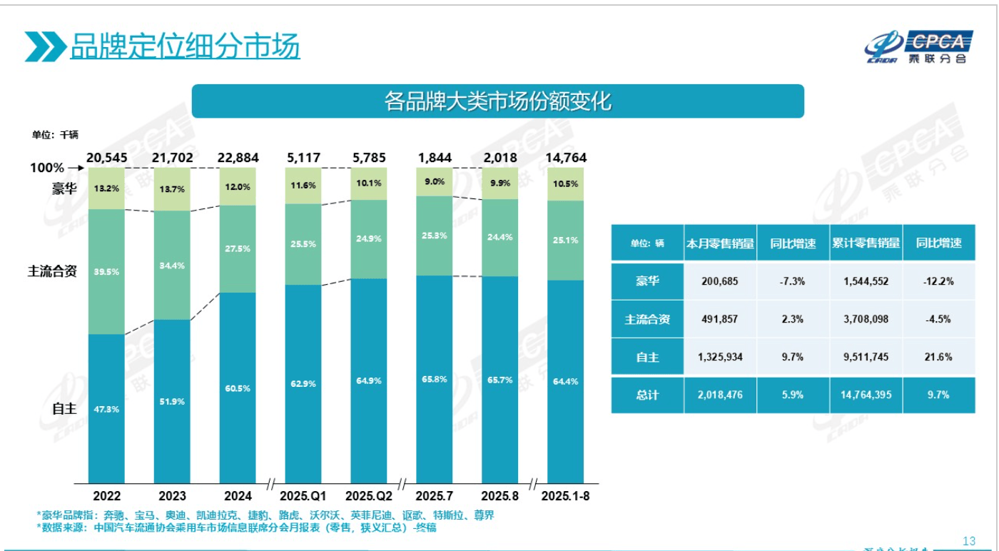 而据乘联分会数据,国内豪华车市场整体承压,今年前8个月,国内豪华车细分市场累计零售销售约154.5万辆,同比下滑12.2%,市场份额为10.5%。