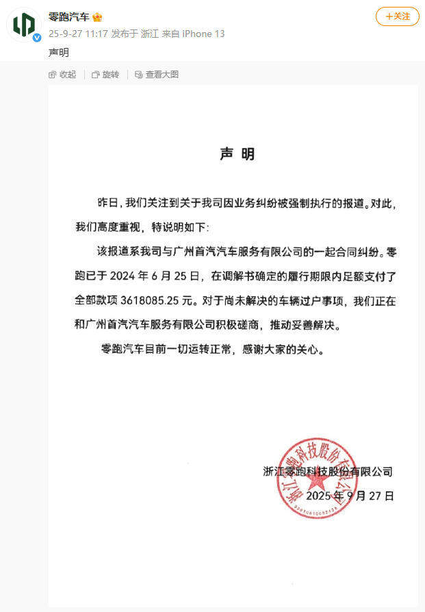凤凰网科技讯(作者/于雷)9月27日,针对“零跑汽车成失信被执行人,创始人被限制高消费”的报道,零跑汽车官方今日发布声明表示,公司已高度重视此事,并强调已于2024年6月25日,在调解书规定的期限内,一次性足额支付了全部款项3618085.25元。零跑方面还表示,目前公司运营一切正常,对于遗留的车辆过户问题,仍在与广州首汽方面积极磋商解决。