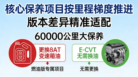 核心保养项目按里程梯度推进,版本差异精准适配。基础保养(每10000公里):更换丰田0W-20认证全合成机油,2.0T燃油版需5.5L,2.5L双擎版需5L,搭配机滤更换;双擎版同步检测电池管理系统与电机冷却管路。深度项目中,双滤芯每20000公里更换;制动液(DOT4规格)与火花塞每40000公里更换;60000公里大保养:燃油版需更换8AT变速箱油,双擎版E-CVT无需换油;燃油滤清器每8000公里更换,冷却液每10万公里更换。