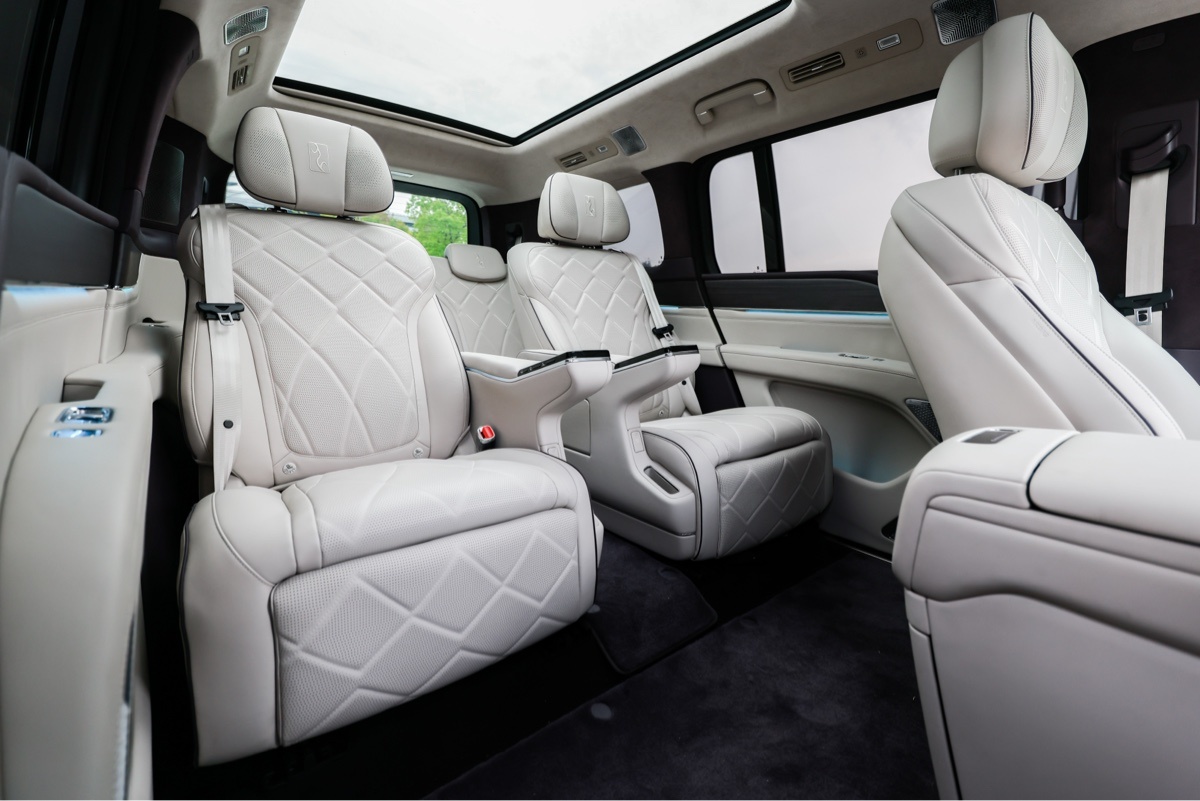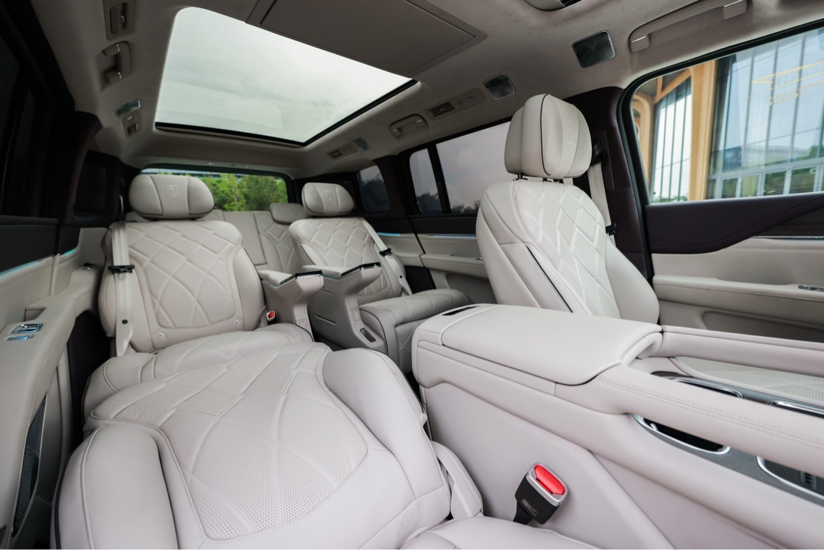 来到车侧,可以明显看到从B柱开始往后都做了加长。这台车采用的是2+2+2的六座布局,以更大空间和行政豪华配置,确保每一排乘客的宽奢体验,满足高端用户多场景的用车需求。