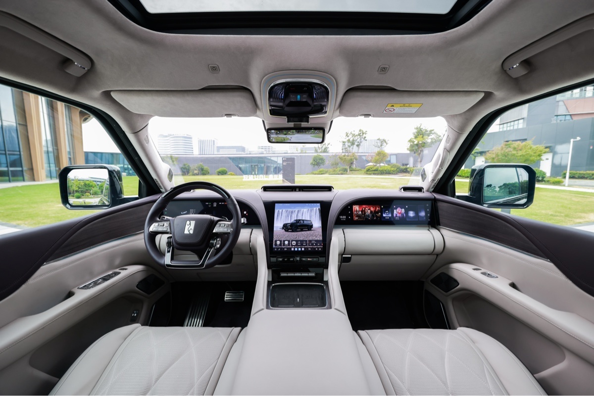 内饰方面,新车整体中控区域与U8基本一致,同样配备了曲面中控屏幕与副驾娱乐屏+仪表屏在内的三联屏。此外,二排空间还配备了左右两个小桌板,同时上方还搭载了一块吸顶娱乐屏。