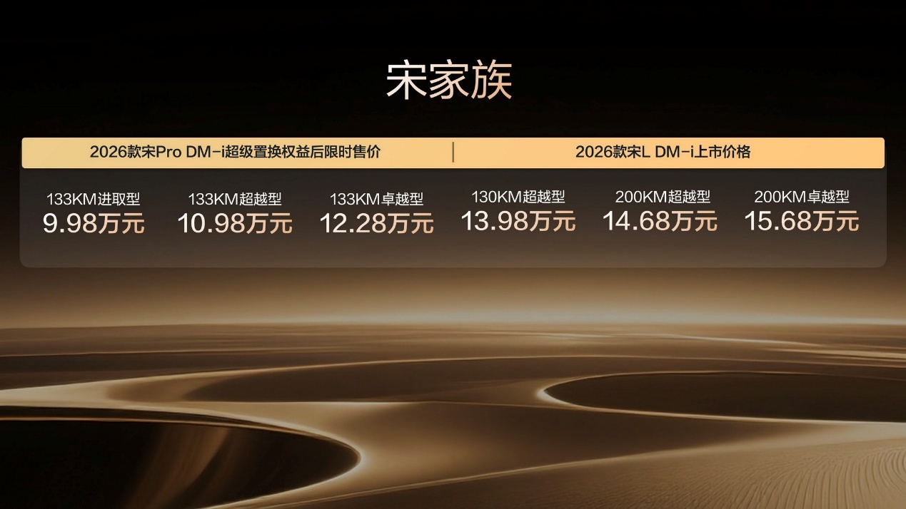 其中,2026款宋L DM-i售价13.98-15.68万元,2026款宋Pro DM-i超级置换权益后,限时售价9.98-12.28万元。同时,两款车型均带来了丰厚的上市权益礼。