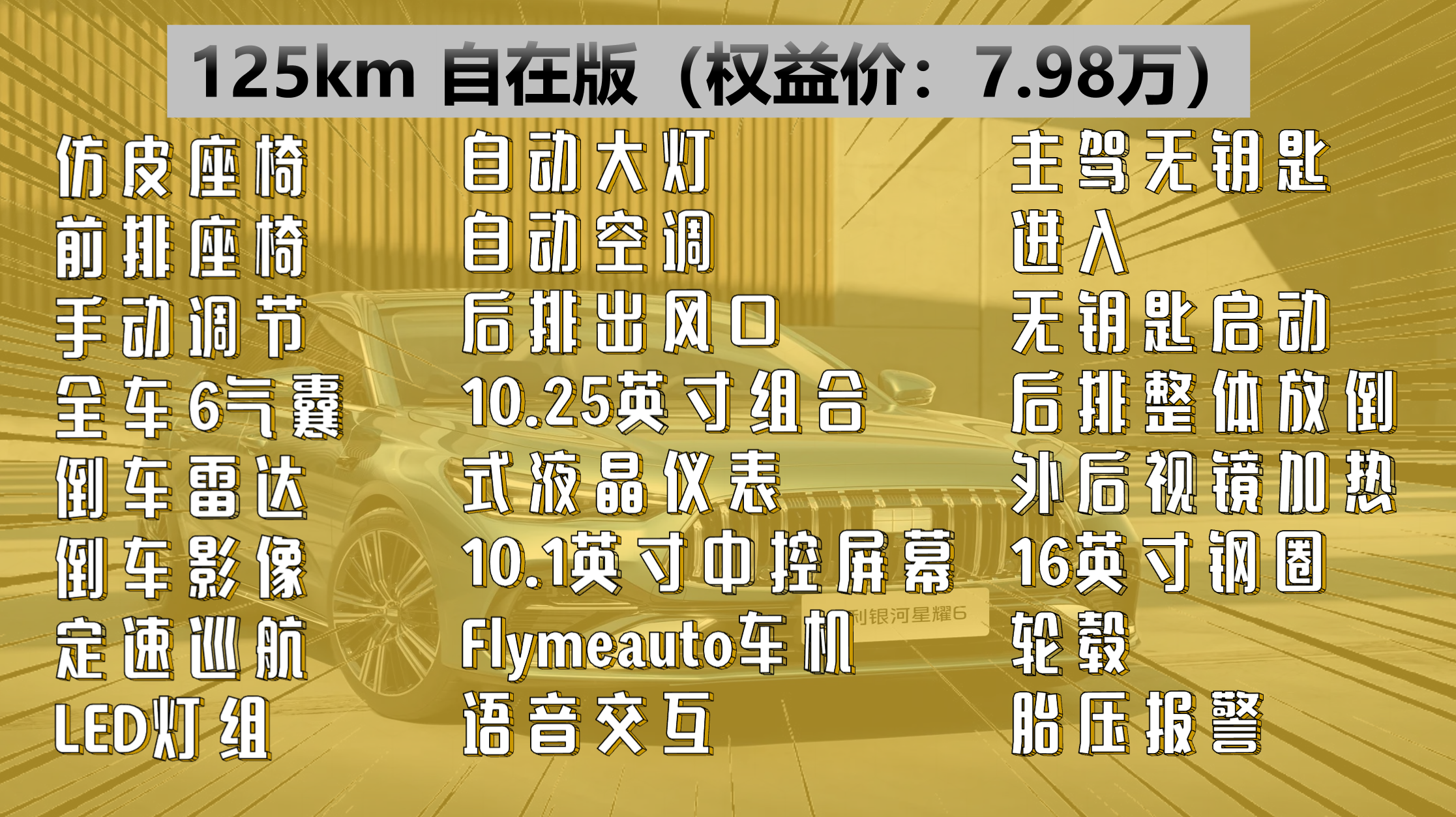 如果你不想,新车刚买就停产,那直接看125km续航版本就行。先看最入门的125km自在版,7.98万的限时权益价,配置如图所示,比网约车强不了多少。手动调节的仿皮座椅,全车六气囊,倒车雷达,倒车影像,定速巡航,LED自动大灯,后排出风口,Flyme Auto车机系统,10.25英寸组合仪表+10.1英寸中控,能称之为配置的,也就这些吧。