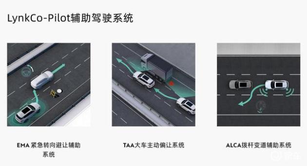 辅助驾驶方面,2026款领克09搭载了“LynkCo-Pilot辅助驾驶系统”,配合22颗感知硬件(1颗前视摄像头+4颗环视摄像头+5颗毫米波雷达+12颗超声波雷达),使得车辆支持:AEB主动式紧急刹车辅助系统(带行人识别)、ALCA拨杆变道辅助系统、APA自动泊车辅助系统、TAA大车主动偏让系统、EMA紧急转向避让辅助系统等20余项功能。