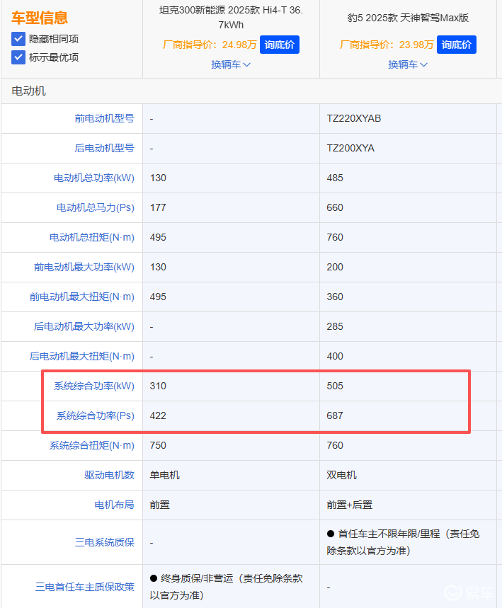 不仅如此,因为“电为主”的路线选择,拥有双电机加持的方程豹豹5综合功率高达687kW,比坦克300 Hi4-T宁德时代版高了足足195kW,换算一下马力大了265匹;并且对广大家庭用户来说,方程豹豹5的尺寸更大,这也意味着它的车内空间容量更大,在载物方面表现会更好。