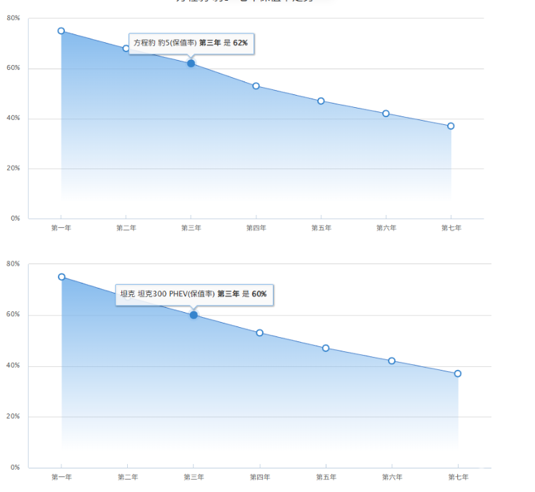 另外从市场保值率角度分析,我们从某汽车网站查询所得,坦克300插混版三年保值率仅60%,方程豹5三年保值率为62%。差距看似不大,但结合25万元左右的购车预算,二手车转售时就会拉开5000元左右的差价,对于注重长期用车成本的家庭用户来说,这也是一笔不容忽视的开支。