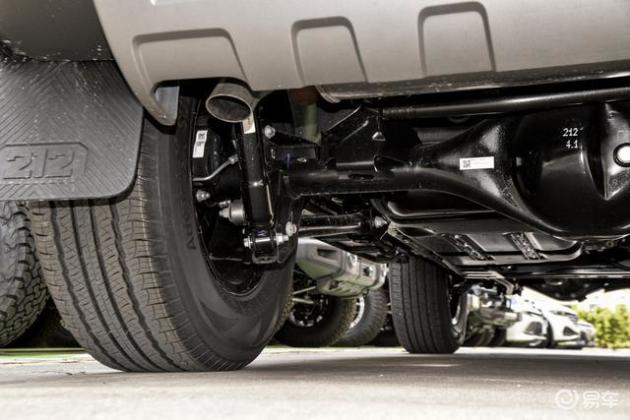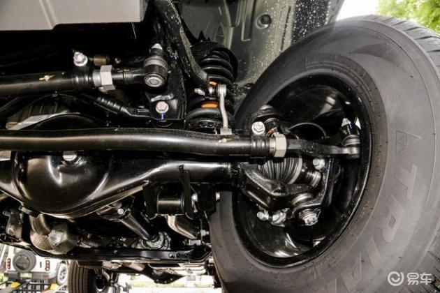 车辆采用非承载式车身结构,前后均为五连杆整体桥式悬架。这种结构在舒适性方面并非取向重点,但在耐久性、抗冲击能力和负载稳定性上更具优势。整体桥在交叉轴工况下能够保持较好的轮胎接地状态,也更适合改装、加装越野附件或长期高强度使用,对目标用户而言具备可预期的使用价值。