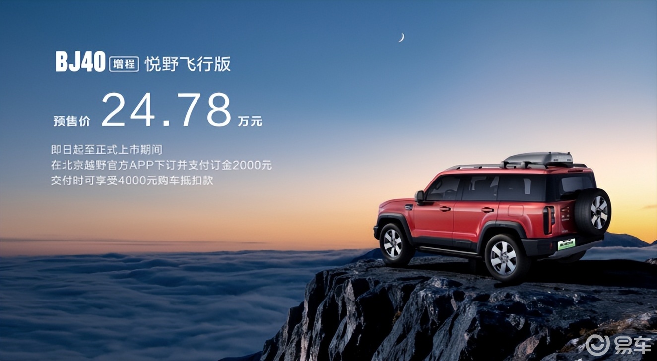 1月27日,北京越野BJ40增程赤兔标准版正式上市,官方指导价27.98万元,并在现场进行了首批车主交付。同步上市的还有燃油巨幕版车型,售价13.29万-14.39万元。此外,BJ40增程悦野飞行版开启预售,预售价24.78万元。会提供车载无人机。